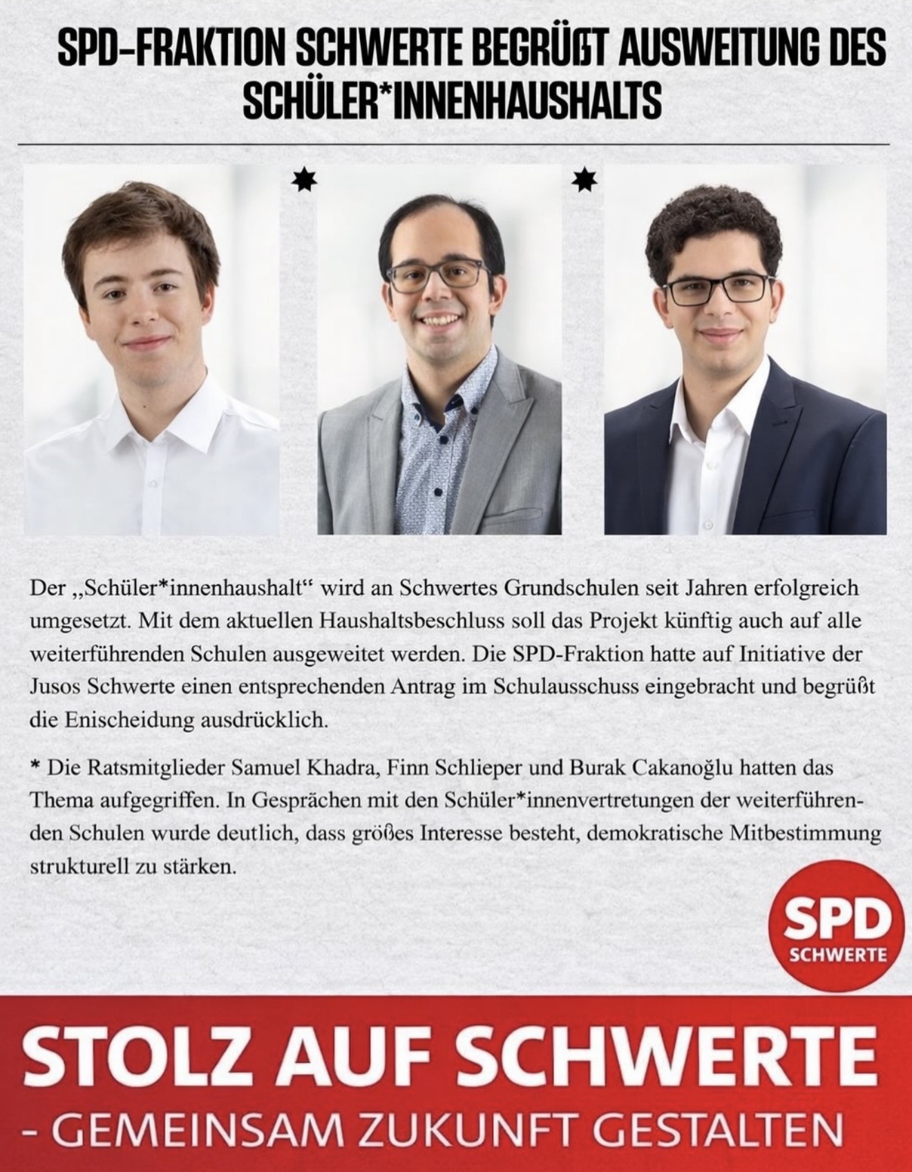 Gerade in angespannten Zeiten zeigt sich politische Seriosität darin, Schwerpunkte zu setzen – und nicht alles gleichzeitig zu versprechen. Für uns ist klar: An der sozialen Infrastruktur, an Bildung, an Teilhabe und am Zusammenhalt unserer Stadt werden wir nicht sparen.
