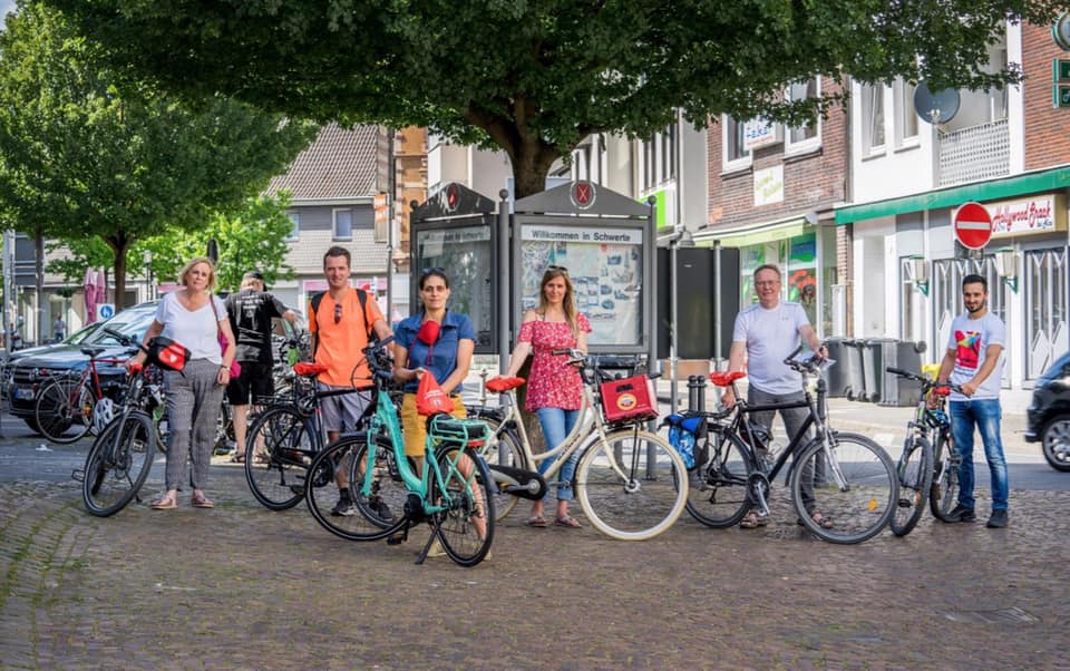 Foto mit den Fahrrädern: Marc Seelbach,  Jennifer Sandhu, Natascha Baumeister, Achim Riggert, Zulmai Salehi