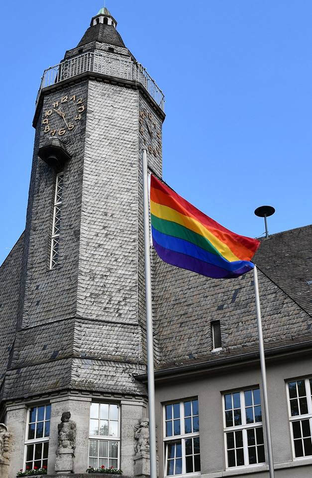 Wir feiern den Tag der Befreiung vom $ 175 StGB und deswegen hisst der Bürgermeister von Schwerte Dimitrios Axourgos heute die Pride (Regenbogenfahne) am Schwerter Rathaus.