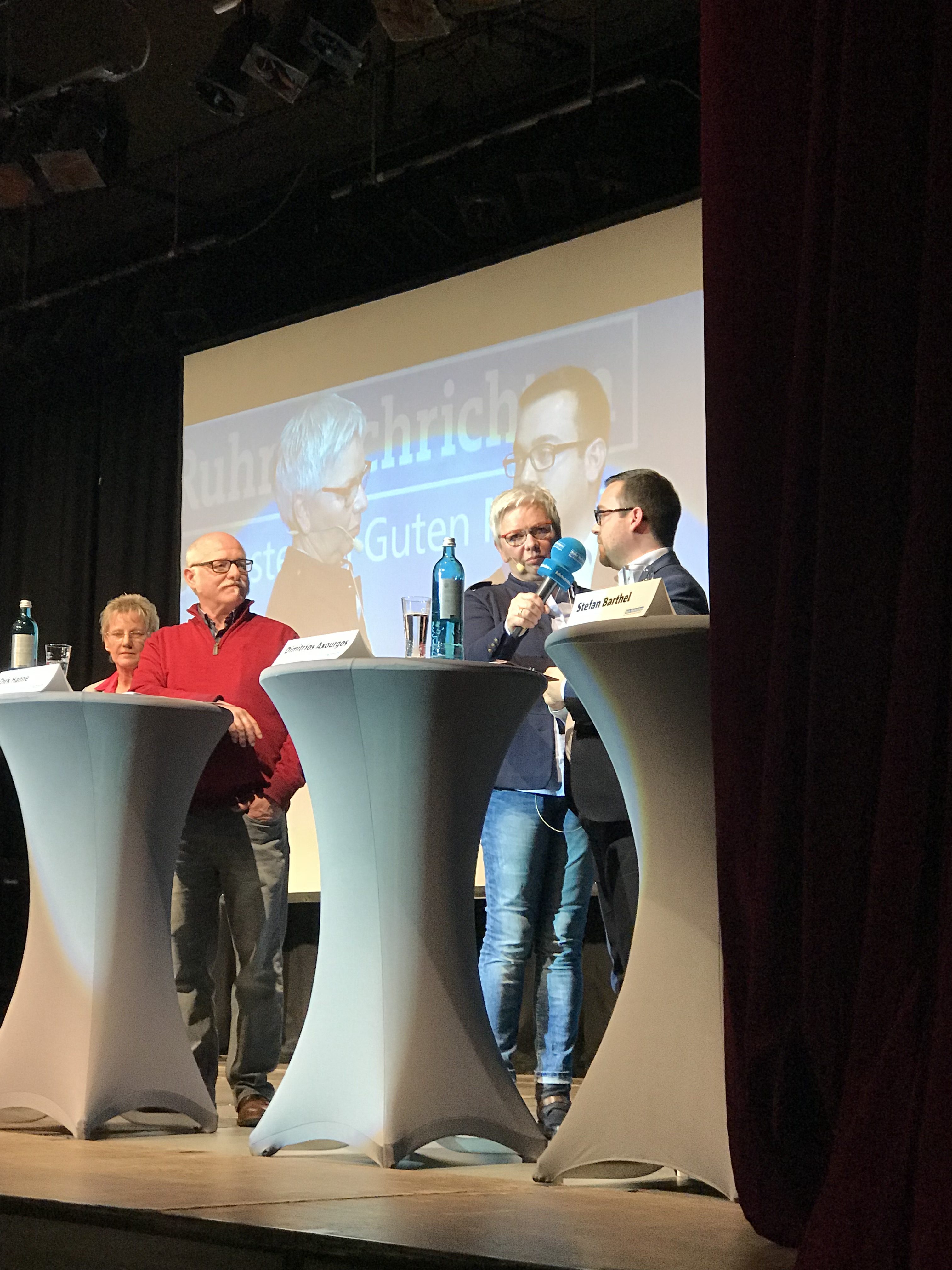 Herr Becker von der Bürgerstiftung Rohrmeisterei stellt die bisherigen Maßnahmen für eine berufliche Qualifizierung bis hin zur Ausbildung vor, die von Seiten der Bürgerstiftung für Flüchtlinge initiiert worden ist. Eindrücklich war die Erzählung von einem Flüchtling, der viele Hindernisse und Schwierigkeiten, die von Seiten der Bürokratie aber auch persönliche Rückschläge berichtete. Er absolviert mittlerweile eine Ausbildung in der Rohrmeisterei als Koch.