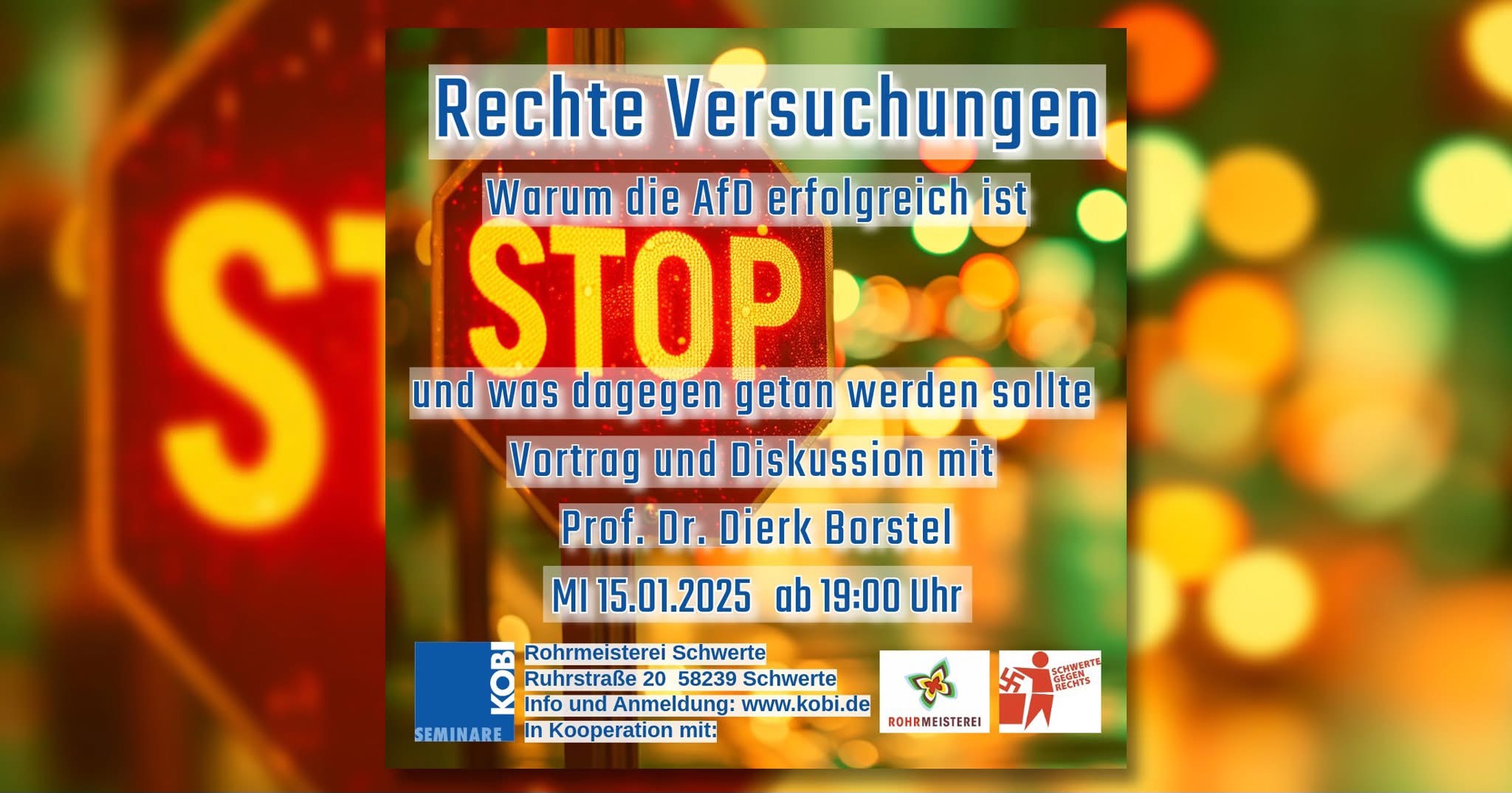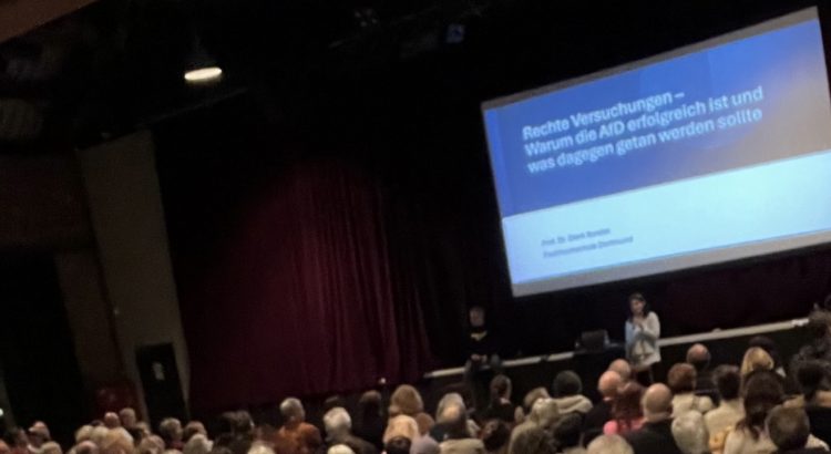 Die westliche Welt rutscht nach rechts. In Amerika regiert zukünftig Trump, in Frankreich vielleicht bald Le Pen und in Deutschland erlebt die AfD Höhenflüge und wurde in mehreren Bundesländern stärkste Partei. Was steckt hinter dieser Entwicklung? Was sind ihre Triebfedern? Was bietet die AfD an? Und vor allem: wie kann damit umgegangen werden? Helfen Verbote oder braucht es andere Antworten? Diesen Themen ging Prof. Dr. Dierk Borstel in seinem Vortrag nach.