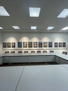 Zwei Ausstellungen pro Jahr soll es geben, Kuratorin ist Frauke Andrea Schütte, und sie meint schmunzelnd: „Ich kann mir gut vorstellen, dass manch eine*r bei langen Sitzungen die Zeit nutzt, die Bilder in Ruhe zu betrachten.“