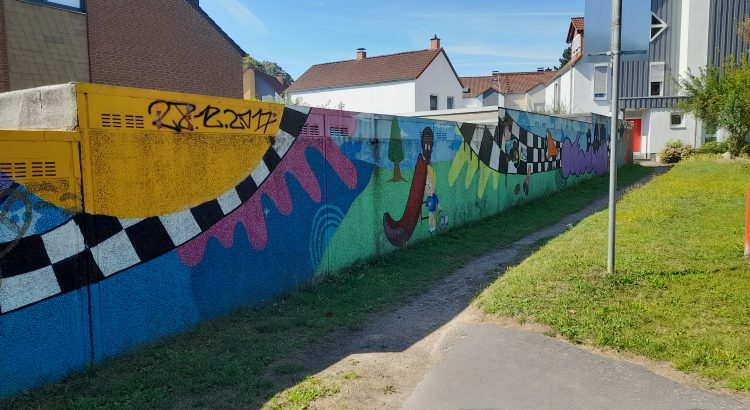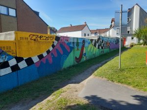 Die lange Garagenrückwand wurde unter Einverständnis der Eigentümer auf Veranlassung der SPD von Faktor Ruhr mit wunderbaren Motiven versehen.