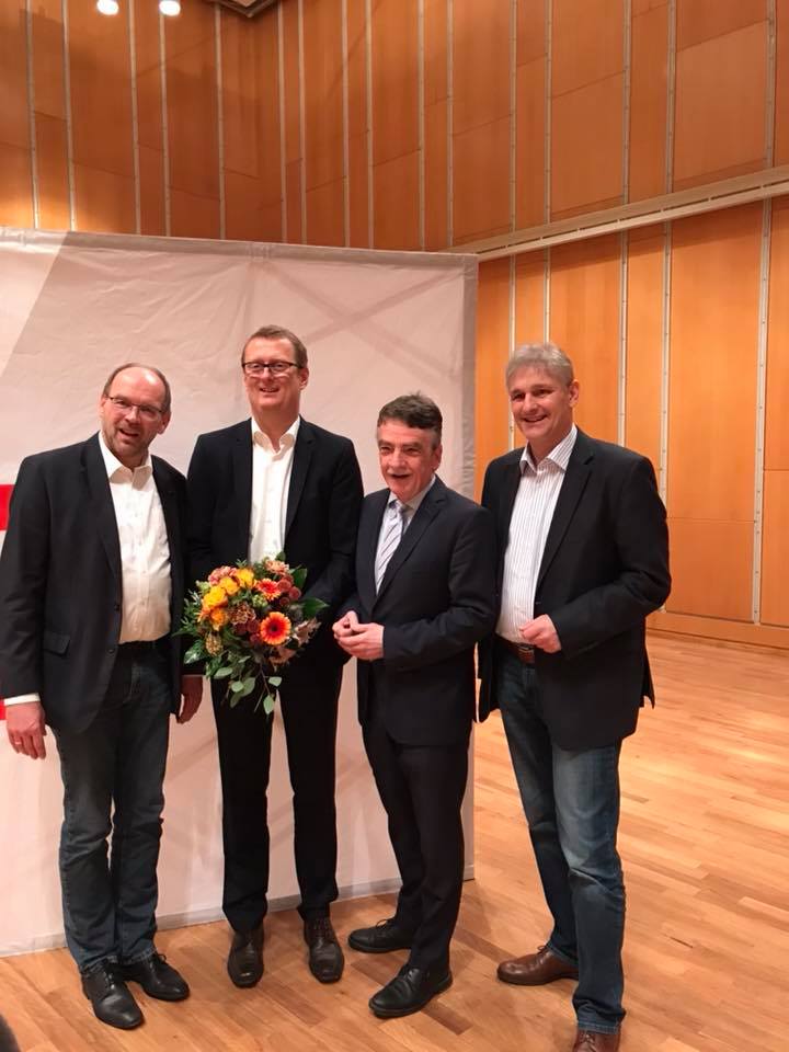 Das Foto zeigt Michael Makiolla mit Oliver Kaczmarek, dem SPD-Landesvorsitzenden Michael Groschek und dem ehemaligen NRW-Arbeitsminister Rainer Schmeltzer in der Stadthalle Kamen.