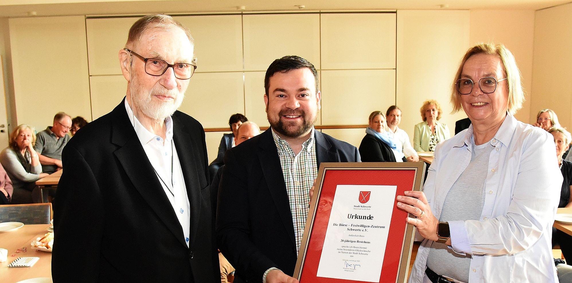 Schwerte. 20 Jahre plus eins sind es her, dass sich in Schwerte das Freiwilligenzentrum „Die Börse“ gegründet hat. „Wesentlicher Motor war damals Schwertes ehemaliger Stadtdirektor Ernst D. Schmerbeck“, so Bürgermeister Dimitrios Axourgos. Bei der Feierlichkeit am Montag saß dieser Mann in der ersten Reihe – mit 93 Jahren! Ihm galt großer Dank und ganz viel Applaus.