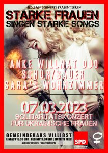 SPD und ASF präsentieren anlässlich des Weltfrauentags 2023 am 7.3. ein Konzert, das sie insbesondere den Frauen in der Ukraine widmen.